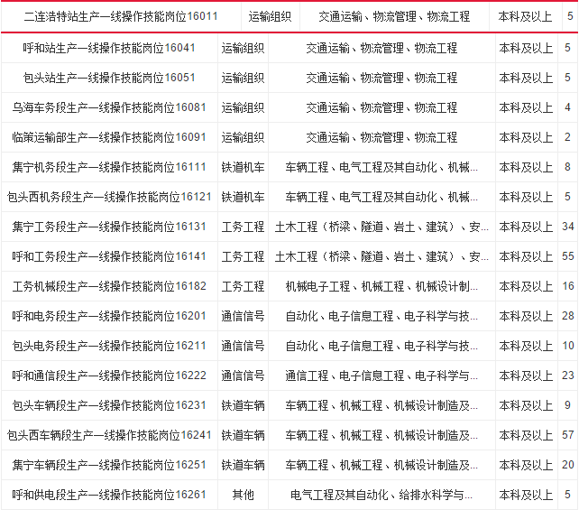 本次招聘崗位全部為呼和浩特鐵路局局屬單位生產(chǎn)一線操作技能崗位,具體招聘崗位信息見附表。